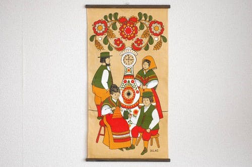 民族衣装をまとった男女が、思い思いに寛いでいる姿がほのぼのとした雰囲気のタペストリーです。目に留まるたびに心を和ませてくれそうです。