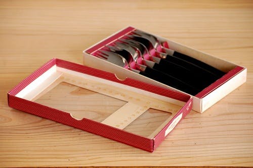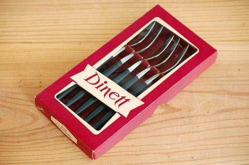 紙でできた箱は少々使用感がありますが、フォークは僅かなコキズがあるだけで、ヴィンテージ品としては良好なコンディションです。嬉しい6本セットですので、おもてなしのシーンにもじゃんじゃん活躍させたくなるカトラリーです!