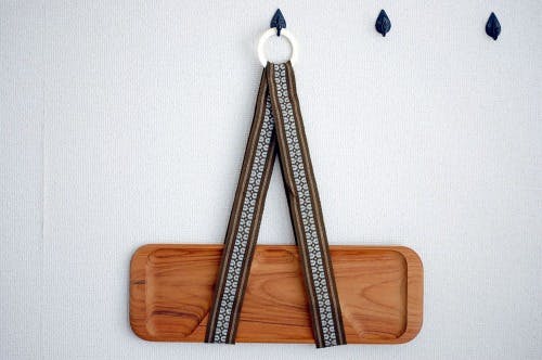 木製の輪っか部分を壁などに固定して、布の輪っかにトレーを引っ掛けるように使います。