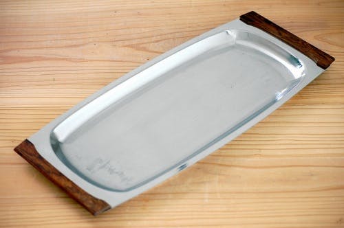 スウェーデンで見つけた、チーク材の持ち手が魅力的なステンレス製ロングトレーです。