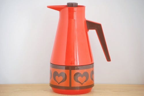 スウェーデンで見つけた、プラスティック製のヴィンテージ魔法瓶(レッド、ハート柄)です。