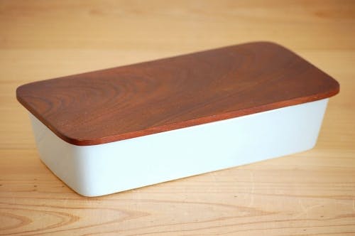 シンプルな雰囲気が魅力的なこちらのバターケース。味わいのある木蓋が温かみをプラスしています。