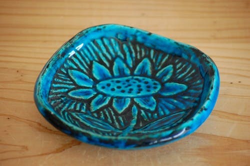 こちらは鮮やかなブルーのお色といい、力強く施されたヒマワリの絵柄といい、手に乗せた時のずっしり感といい、小ぶりながらも強烈な存在感を放つ一品です。