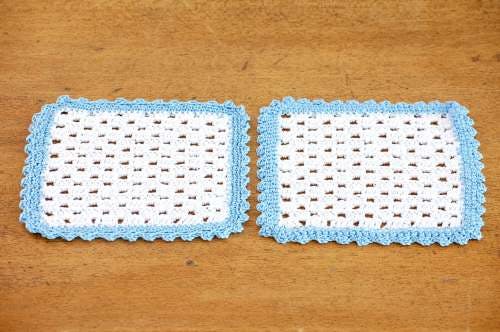 スウェーデンで見つけたスクエア型の手編みドイリー2枚セット(水色の縁取り)です。