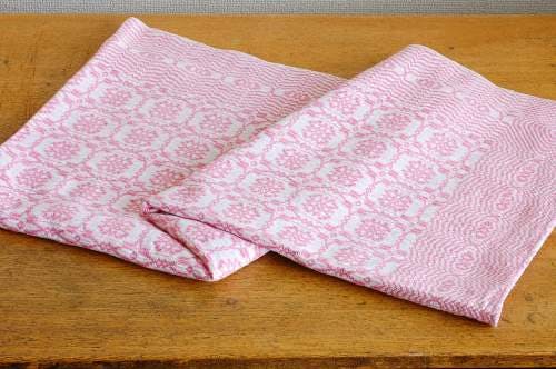 丁寧に、そして繊細に織られたお花のような模様といい、決して甘すぎないピンク色といい、しっかりとした張りのある手触りといい、文句なしに魅力的なテーブルクロスです。