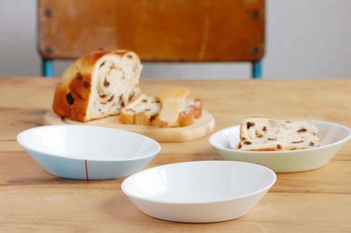 tiltシリーズの食器には、ひとつひとつ異なる赤のステッチプリントが1本だけアクセントとして入っています。縫い目のようにも見える赤いステッチラインが、シンプルテイストに映える愛らしいアクセントになっています。