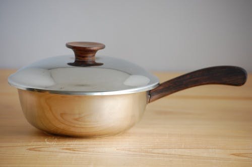 デンマークで見つけた、ステンレスとチーク材のコンビが北欧テイスト満点の片手鍋です。