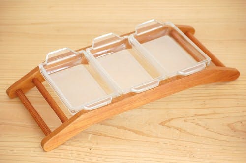 スウェーデンで見つけた、木製の台付きガラスプレートのオードブルセットです。