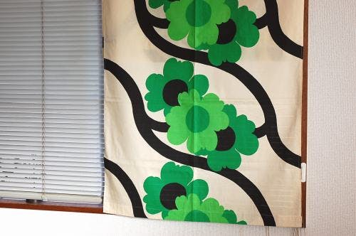 スウェーデンで見つけた、ヴィンテージカーテン2枚セット(グリーン&ブラック花柄)です。こちらはコットンの張りのある素材なので、タペストリーのようにして空間にかけても素敵だろうな~と想像します。