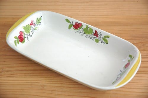 イエローのペイントが温もりあるアクセントになっていて、プレートの内側に描かれたグリーンの葉っぱと赤いお花の模様も女性らしい優しさを感じさせてくれるデザインです。