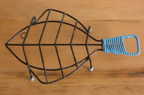 ユーモアたっぷりのフォルムデザインといい、お魚の尾っぽの部分に巻かれたビニールストロー素材のようなカバーが鮮やかな水色であることなど、魅力たっぷりの古い台所道具かと思います。