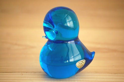 このオブジェは丸々とした体つきが愛嬌たっぷりで眺めているだけで心が和みます。また、安定感があるのでオブジェとしてだけでなく、ペーパーウェイトとしても実用的にお使いいただけます。また光にかざすと、ガラスのブルーのお色がさらに透明感を増し、淡く美しく目に映ります。ぜひ、光がよく差し込む窓辺などに飾ってあげてほしいなと思います。