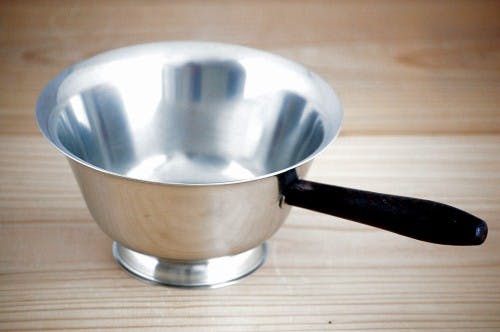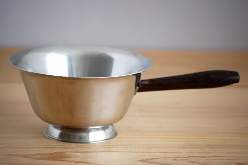 デンマークで見つけた、ステンレスとチーク材の組み合わせが北欧テイスト満点なソースパン(高台付き)です。