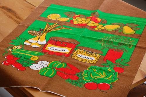 新鮮で美味しそうな野菜や果物がいっぱいに描かれたタペストリー。キッチンの壁に取り付けたらよく似合いそうな雰囲気です!