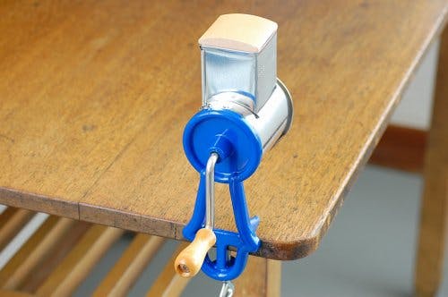 そして大変便利なのが、テーブルやキッチンカウンターにネジで固定できるようになっているので、使わない時でもキッチンやテーブルに取り付けておいて、道具の雰囲気を楽しむこともできてしまうのです。鮮やかなブルーのペイントが空間のよいアクセントになってくれることと思います。これはオススメの道具です!