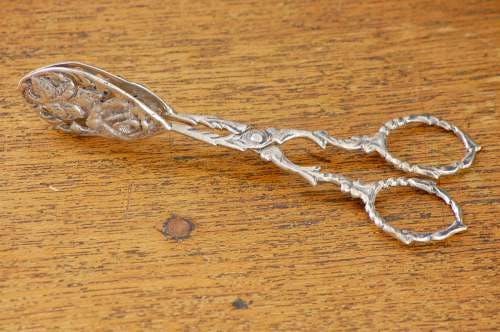 バラの装飾がエレガントな印象です。この道具を使って、角砂糖などをはさむような形でコーヒーや紅茶の上に落とすことができます。