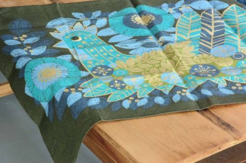渋いオリーブグリーンをベースに、きれいなブルーグリーンとゴールドで描かれた絵柄の色使いが絶妙です!よくよく見てみるとキュートなニワトリのモチーフなのですが、そのシックな色合いからかゴージャスでいながら落ち着いた印象も受けます。