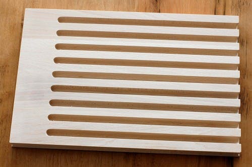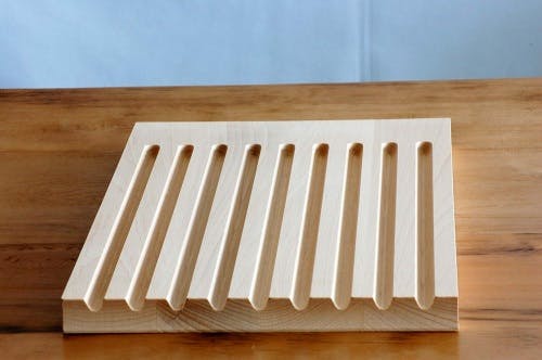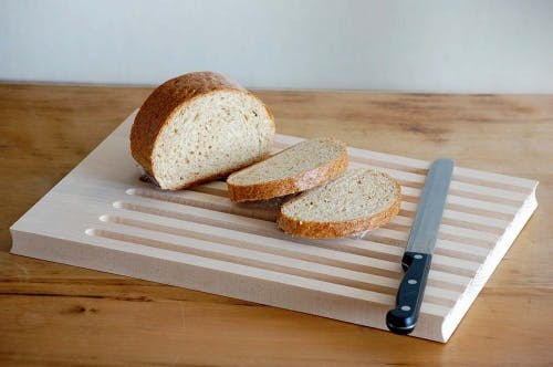 こちらはブナの木で作られたブレッドボードになります。ブレッドボードはその名の通りパンを切る専用のボードですが、なかなか気に入った、そして使い勝手のよいデザインのものに出会えなかったのですが、こちらは洗練されたデザインに天然木ならではの温もりがプラスされ、さらにブレッドボードとしての機能性に溢れているところに大きな魅力を感じました。