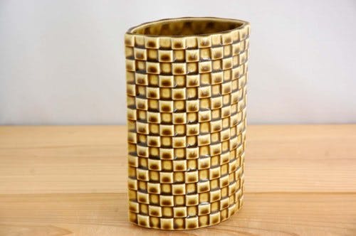 網目状に突起したデザインといい、落ち着きや深みを感じさせてくれるブラウンにもモスグリーンにも見えてくる独特の色合いといい、全体的な光沢の美しさといい、花瓶としてオブジェとしての存在感には圧倒されるものがありました。