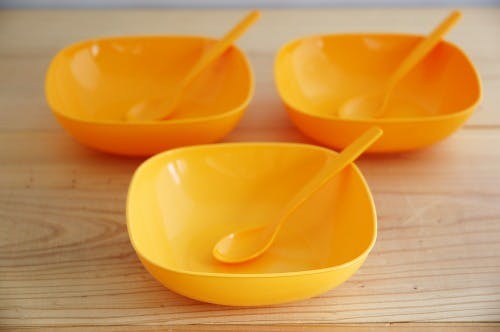 スウェーデンで見つけた、プラスティック製の可愛いピクニック食器セットです。オレンジ色の鮮やかなボウルとスプーンのセットになります。