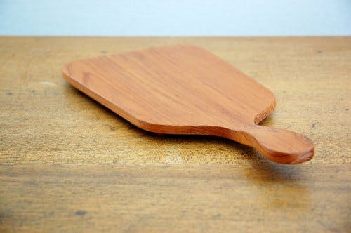 スウェーデンで見つけた、チーク素材の持ち手が付いたカッティングボードです。
