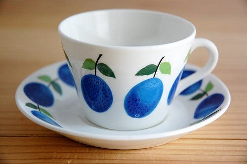 鮮やかなブルーのプラムがカップとソーサーそれぞれにグルリと並ぶ、本当に可愛らしいデザインです。眺めているだけでも元気をもらえそうなハツラツとした雰囲気があります。