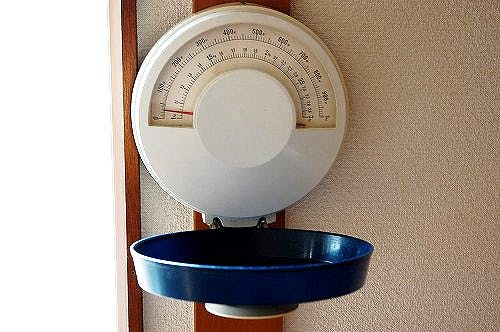 壁に短いビスなどを打って簡単に掛けられるようになっています。蓋の内側がそのまま量り台になっていますので、蓋を開けその上にボウルなどを置いて計量することが可能です。物を台の上にのせると、量り針が動きます。