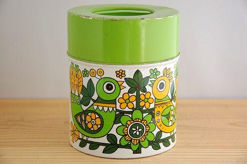 スウェーデンで見つけたレトロなブリキ缶(グリーン小鳥柄)です。