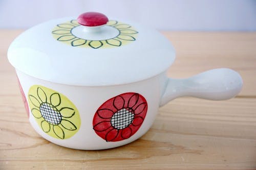 本体や持ち手部分のポッテリとした丸みのあるフォルムや、イエローや濃いピンクで色づけされた向日葵のような花模様が魅力のお品です。蓋のつまみ部分のピンクのペイント可愛いアクセントになっています。