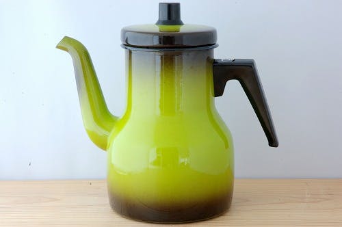 もぎたての青リンゴのようなライトグリーンのグラデーションが目にも鮮やかなポットです。キッチンのコンロの上にいつものせておきたくなるような、そんなデザインですね。お湯を沸かしてコーヒーや紅茶を飲む時間が何だかとても楽しくなりそうな気がします。