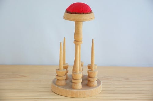 カラフルな糸巻きを立てて、実際にピンクッションに針を刺せば、もっともっとその雰囲気は高まることでしょう。インテリア雑貨のような感覚でお使いいただける古き良き道具のひとつだと思います。