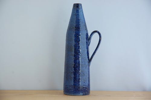 手にとるとズッシリとした重みがあり、深い深いブルーの色合いといい、美しい光沢といい、持ち手が付いた花瓶としてはちょっと珍しい形状といい、多くの魅力に溢れる花瓶です。