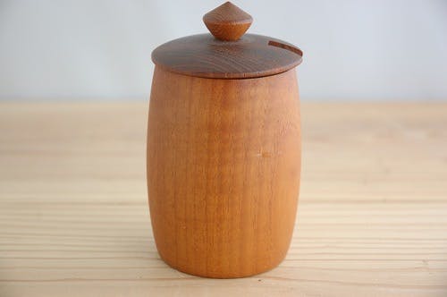 スウェーデンで見つけた、チーク材のマスタードポット(ガラスカップ入り)です。