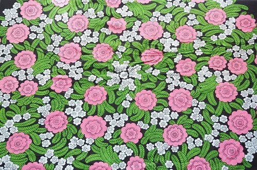 黒い布地と、そこにプリントされた模様の色のコントラストがとても美しく、空間のなかではっきりと存在を主張してくれそうなお品です。