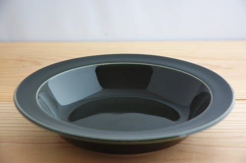 深いグリーンの釉薬が本当に美しく、とてもシンプルなデザインだというのに食卓の上での存在感ははっきりとしたものだと思います。ビシソワーズやクリームシチューなど、器に注いだ姿は綺麗でしょうね!
