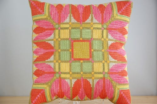 空間を明るく、また気分を明るくしてくれるような、クッションを取り囲むピンク色とオレンジ色のチューリップがポイントです。