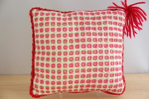 スウェーデンで見つけたクッションです。ちょっと小ぶりなサイズといい、規則的に並ぶピンク色の小花模様が愛らしい一品です。