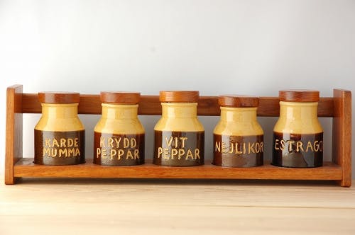 色々な調味料やスパイスなどをポットに入れ、台所の棚の上に木製ラックごとそのまま置いて使うもOK、木製ラックは壁に掛けれる造りにもなっていますので壁に取り付けて使うのもOKです。