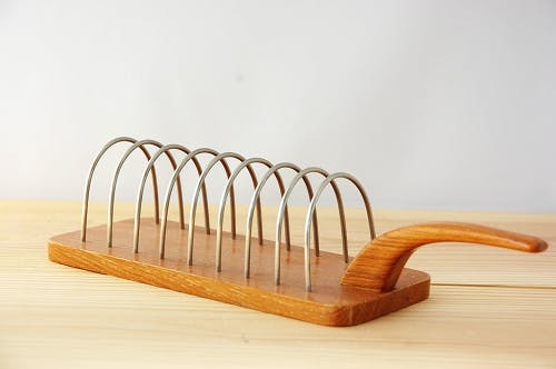 チーク材と金属の組み合わせで出来た、このデザインのトーストスタンドを私もずうっと探していました。見つかった時は本当に嬉しかったです!きっとお探しだったお客様もいらっしゃるのではないかと。