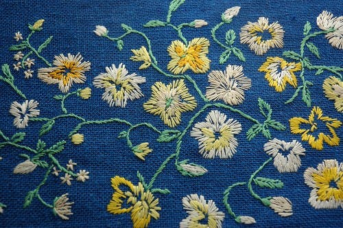 ハッとするような濃いブルーの布地に、可愛らしい花模様が刺繍されており、そのコントラストがとても美しい一枚です。