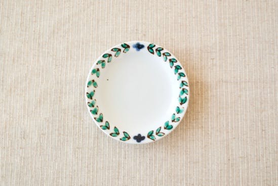直径約10.6cmの小さめのお皿です。フチにあしらわれた葉は優しいグリーン。ひとつずつ丁寧に絵付けされていますね。
