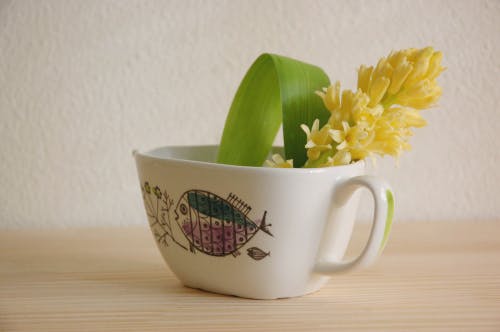 また画像のようにお花を活けてテーブルの上に飾ったりするのもオススメの使い方です。ヒヤシンスなど茎の部分をあまり見せずに飾りたいお花などピッタリの相性ですね!