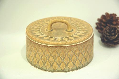 蓋の部分に円形に規則正しく並んだ木の葉がとても印象的なお品です。