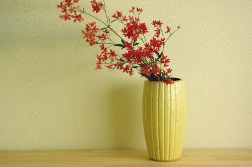 地色のこっくりとした黄色と、活ける草花との色のコントラストを楽しめる一品。一生モノの花瓶となること間違いなしのオススメのお品です。