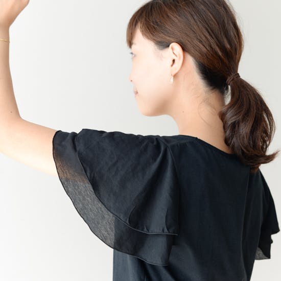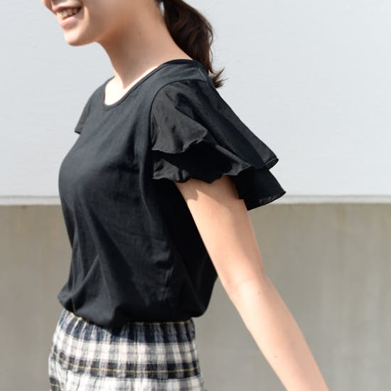 2枚に重なったフリルは、タンクトップのように涼しく過ごしたい!でも二の腕は隠したい……。そんなわがままを叶えてくれる、理想のかたち。