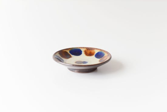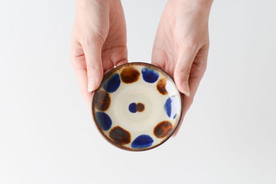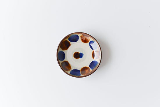 一番の特徴は、飴色とコバルト、2色の水玉模様。「点打」と呼ばれる伝統的な技法を用い、職人が手作業で描いています。そのため同じものはひとつとなく、味わいのある表情が魅力的です。