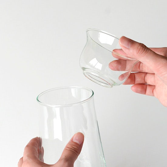 ※型の中でひとつひとつ息を吹き込んで作る吹きガラスの技法で作られています。そのため、上部のカップの形状には個体差があり、多少のぐらつきがあることを予めご了承ください。