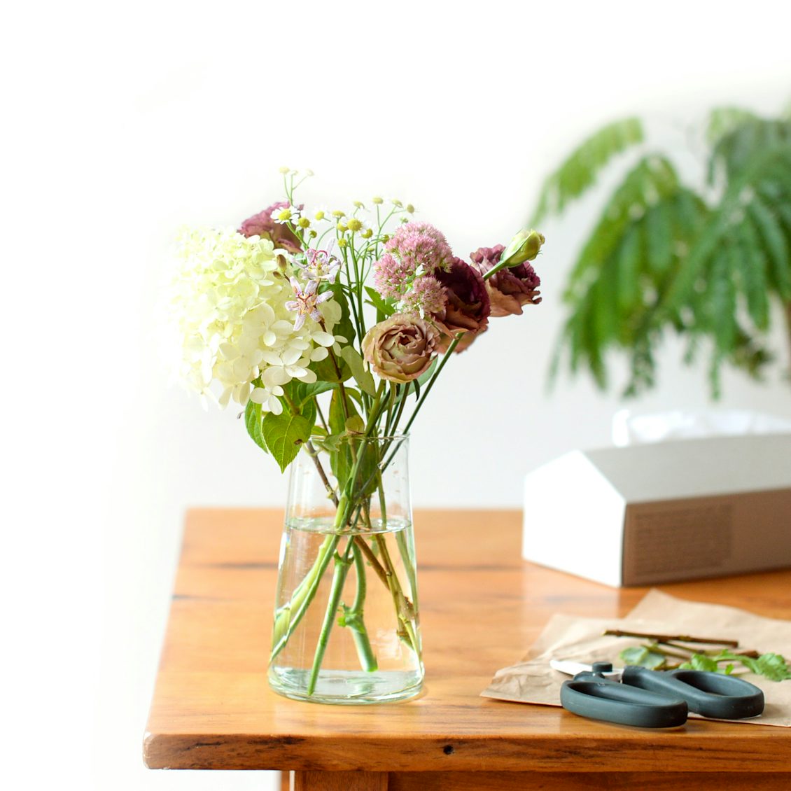 透明感あるガラスの花瓶はどこに並べても違和感なくなじむから、食卓にぽんと置くのにもぴったり。