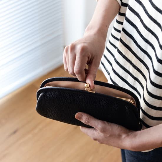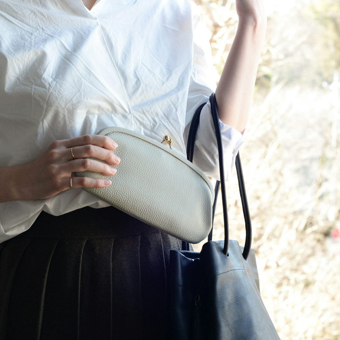 ゴールドの金具は指でつまむ部分だけで、大きく開くがま口の部分には革が張られているため、品よく自然な装いで持てそうです。