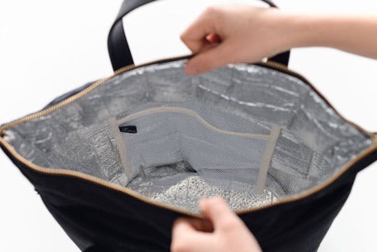 バッグの内側は、保冷効果のある素材でカバーされており、保冷剤を入れればおよそ3〜4時間ほど冷たさを保ってくれます。